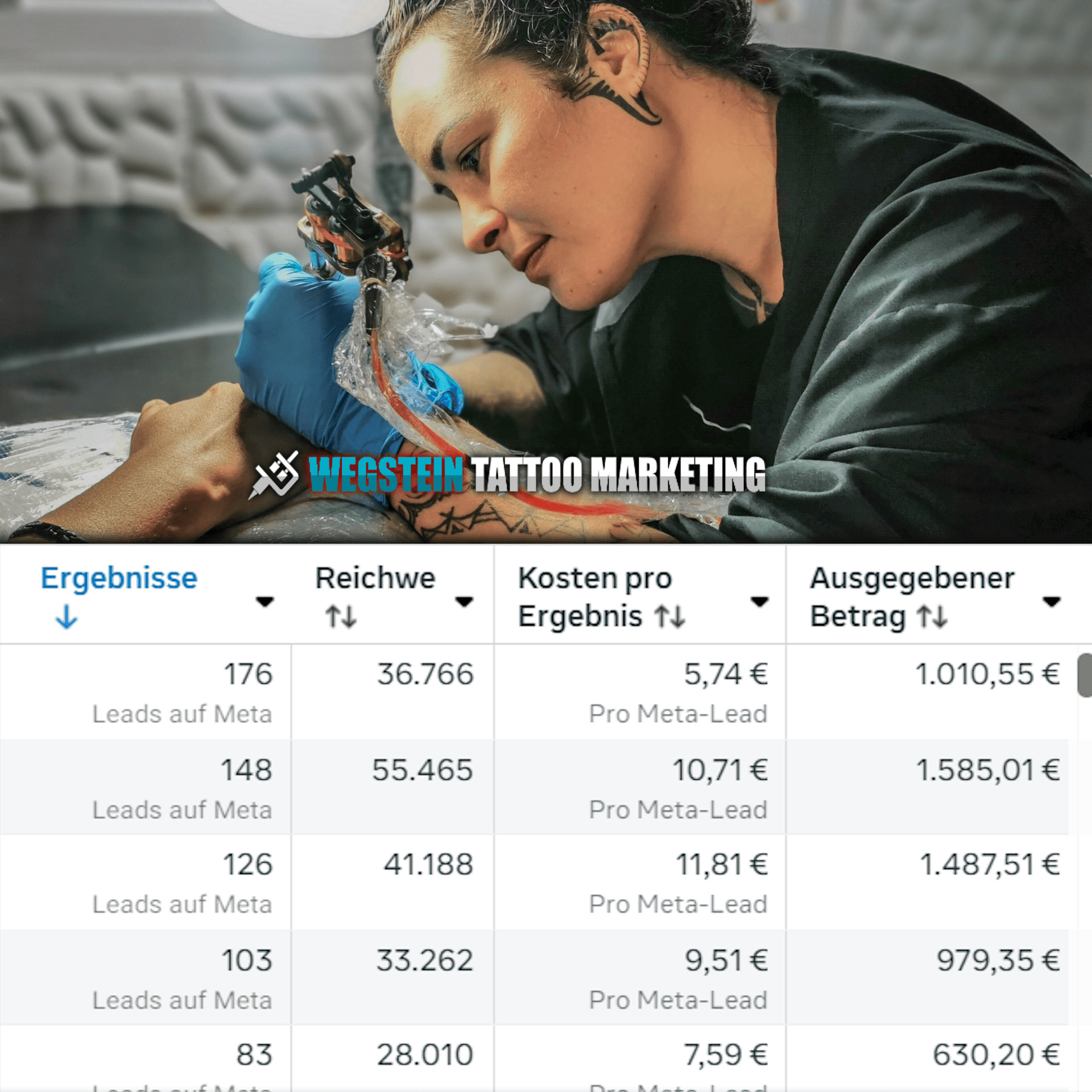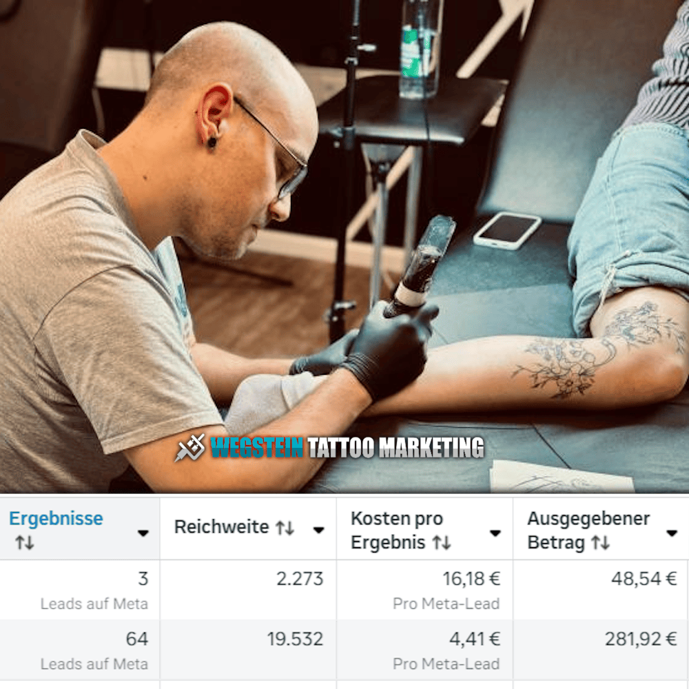 Result: In the very first week: 14 leads and 1.500€ sheduled and paid tattoos from Facebook & Instagram.  → After 4 weeks: calendar fully booked 1 month in advance